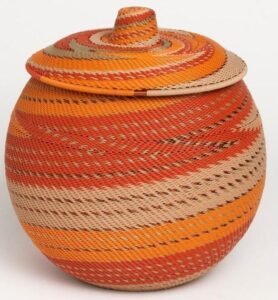 Add color and charm to your home with this Handwoven Wicker Gift Box, featuring a vibrant pattern of orange, red, and earthy hues, perfect for storage or décor.